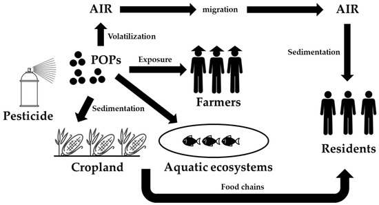 Pesticides are an important source of persistent organic pollutants, and most of the substances in the internationally recognized POPs list are pesticides [76,77]. After pesticides are sprayed, they either remain in the atmosphere in gaseous form, or are dissolved in water vapor, or adsorbed on solid particles. The pesticides decompose into various difficult-to-degrade toxic substances in the atmosphere, which can migrate for a long distance and cause regional pollution [78]. As shown in Figure 3, POPs in the atmosphere can subside to land and aquatic ecosystems, accumulate in crops and animals, and be exposed to human through the food chain, then causing adverse health effects [55,79]. Compared with developed countries, higher concentrations of POPs are generally observed in developing countries [35]. Although many pesticides have been banned, they are still widely used in many areas to kill pests and deal with infectious diseases [37]. Syed et al. evaluated the presence of organochlorine pesticides (OCPs) in the atmosphere of Punjab, Pakistan [34]. The concentration of DDTs in the atmosphere of the study area was much lower than that in the coastal areas of the United States, and comparable to that in the southern United States and the Taihu Lake Basin of China. Pegoraro et al. analyzed the atmospheric POPs in different areas of Cordoba, Argentina, and observed higher concentrations of endosulfan and heptachlor in agricultural areas [37]. Nasir et al. conducted sampling and analysis in industrial and agricultural areas of Pakistan [35], and the results showed that the concentrations of endosulfan, DDTs, lindane, PCBs, and heptachlor in agricultural areas were higher than those in industrial areas, mainly due to their continuous use in agriculture. Because of the long-distance migration and non-degradability of POPs, agricultural waste would enter the Arabian Sea through rivers, which may cause regional or even global pollution. Pesticide deposits in the ocean can also volatilize and reenter the atmosphere to cause secondary pollution. Similarly, crop residues such as straws in farmland can also cause secondary pollution of pesticides. Straw returning can not only reduce the pollution of straw burning, but also help maintain soil fertility. According to the surveys, 70% of corn stalks are put back into farmland in northern China [80], while 70% of rice stalks are left in farmland in Japan [81]. Due to the persistence and bioaccumulation of POPs, pollutants can migrate into the atmosphere and soil through the surface of crops, and pesticides in the soil can also enter the atmosphere again through volatilization. Wang et al. predicted the fate of endosulfan in the atmosphere with the EUSES model [36], and the study indicated that 54.7–70.3% of endosulfan entered the atmosphere by indirect means, such as crop surface volatilization and straw returning.