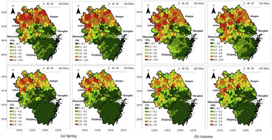 Ratio of emissions from agricultural machinery and road vehicles during busy season (a) Spring and (b) Autumn in the Yangtze River Delta of China [45].