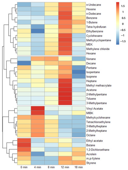 We also conducted the principal component analysis (PCA) to classify each VOC depending on the time point at which the maximum concentration appeared during the drying process. For the PCA, we used the ‘pheatmap’ function in R studio version 1.3.1073. We also generated a heat map showing relative concentrations of VOCs with different time points (i.e., 0, 4, 8, 12, 18 min). A dendrogram in the heat map showed the clustering of the relative concentrations based on the similarity of VOCs occurrence with time. The relative concentrations of each compound with different time points was graded (from −1.5–1.5) using color code in the heat map.