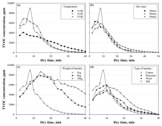 To examine the effects of operational conditions on the concentration of total volatile organic compounds (TVOCs) in exhaust gas, we changed the operating temperature (i.e., 40, 50, 60 °C) and time (i.e., 30, 40, 50 min) in dry unit, weight of laundry (i.e., 3, 6, 10 kg), and material of laundry clothes (i.e., cotton, polyester, wool, silk).