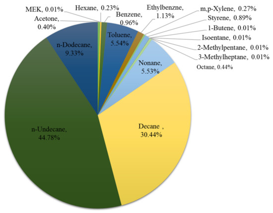 POCPweighted emission of VOCs discharged during drying processes was estimated for 25 compounds whose POCP values are available in the previous literature (Figure 3). The total POCPweighted emission of 25 compounds was estimated as 282.4 POCPweighted emission (data not shown). Among the 25 compounds, Table 2 shows the top 10 VOCs that contributed to O3 generation. The top 10 VOCs accounted for more than 98% of the total O3 generation. Of the 25 ozone precursors included in the POCP calculation, decane (91.6 POCPweighted emission), nonane (61.3 POCPweighted emission) and n-undecane (51.7 POCPweighted emission) were the three main contributors to O3 generation. Decane, with the highest mass generated from one cycle of operation (Table 1), had the highest contribution to ozone production as well, accounting for 32.44% of total POCPweighted emission.