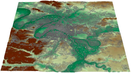 These data have a disk footprint ranging from 1 GB for the topography or land use to 3 GB for the building data. Figure 3 presents a view of the topography and the building data.