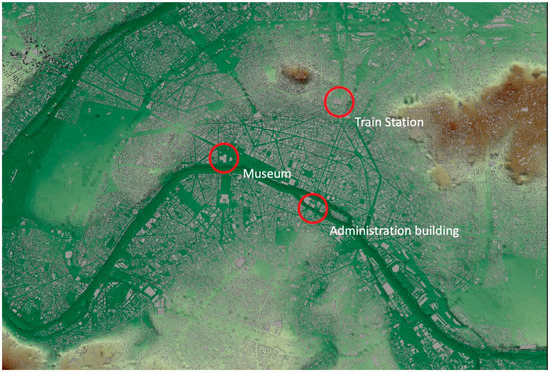 Figure 5. Aerial view zoom of the city of Paris with the specific buildings of interest (red circles).