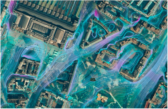 Figure 6. Closeup view of the flow streamlines computed in the streets south and east of the train station. The wind speed ranges from 0 m/s in cyan to 2 m/s in magenta.