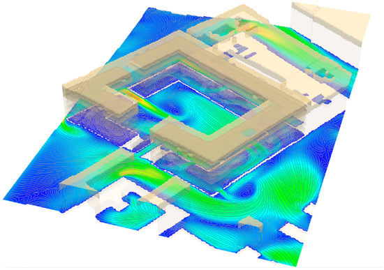 In an urban area, one cannot exclude transfers of pollutants from outside to the inner part of buildings or, vice versa, pollution originating in a building and being transferred outside. Neither the diagnostic nor the momentum version of PSWIFT is appropriate to model the flow inside a building. Thus, computational fluid dynamics (CFD) is needed; more specifically, we used the Code_Saturne model [29], an open-source general-purpose and environmental application-oriented CFD model.