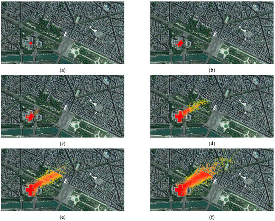 Figure 8. View of the plume inside and in the vicinity of the museum: (a) 1 min after the release; (b) 3 min; (c) 4 min; (d) 6 min (e) 8 min; (f) 10 min. The change from the 1 m resolution of the inner domain to the 3 m resolution of the large domain can be noticed. The threshold for 500 µg/m3 of concentration is in red, while that for 1 µg/m3 is in orange and that for 0.001 µg/m3 is in green.