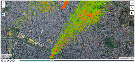 Hence, we relied finally on a tiled web map approach. The results of the simulation are processed on the fly as results are produced [33]. Multiple vertical levels can be treated to provide views not solely on the ground but also in the volume at multiple heights above the ground. Processing takes a few minutes for each time frame since it consists only of a change of file format. Then, results can be consulted in real time through a tile map service using any web browser. Figure 6, Figure 8 and Figure 9 use such an approach.