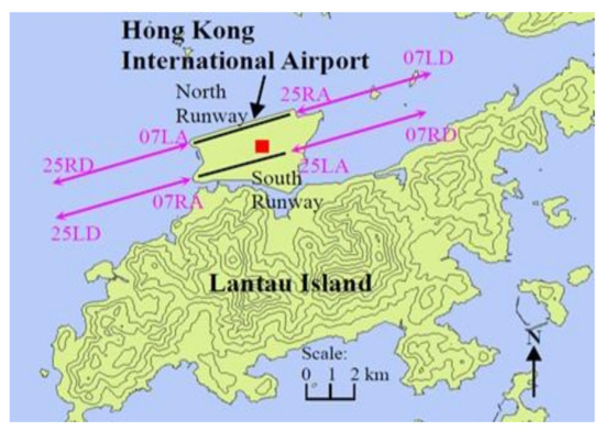 Map of Hong Kong International Airport and Lantau Island (height contours: 100 m) [1], with the location of the LIDAR (red square). Runway corridors are shown as pink arrows with the names marked alongside.