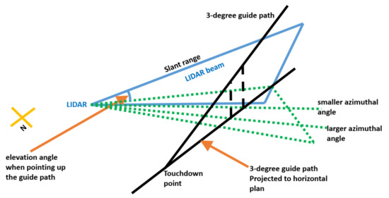 Diagram illustrating a LIDAR glide path scan along the 3-degree glide path for the western approach towards the north runway.