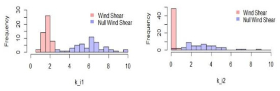 Histograms of ki,1 and ki,2 for wind shear and non-wind shear cases in March 2015. (left) ki,1 for wind shear and non-wind shear cases; (right) ki,2 for wind shear and non-wind shear cases.