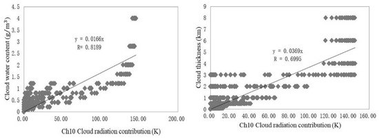 (4) Cloud parameter inversion of a single channel. The theoretical relationship for the inversion is nonlinear, as shown by Equation (9a), and the scatterplots from the simulation to show the dependencies of cloud radiation contribution on cloud water content and cloud thickness are in Figure 1. Though a quadratic or cubic function would be better to obtain the best fitting according to the scatterplots of Figure 1, a linear function for simplicity has been used to obtain the regression model for inversing cloud water concentration and cloud thickness (denoted as and ) from of channel 2, 7 and 10: