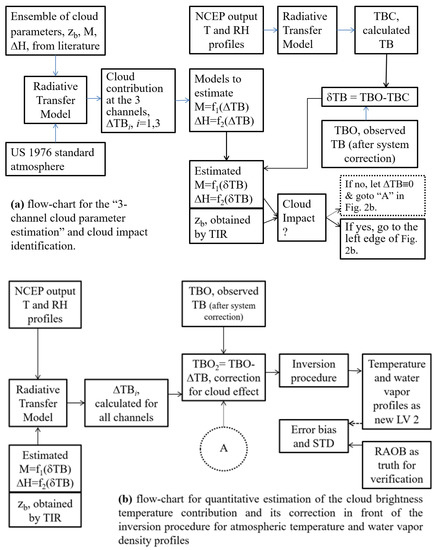 The technical flow chart for this study. (a) Flow-chart for the “3-channel cloud parameter estimation” and cloud impact identification. (b) Flow-chart for quantitative estimation of the cloud brightness temperature contribution and its correction in front of the inversion procedure for atmospheric temperature and water vapor density profiles. CI is equal or close to zero in the case when cloud impact can be neglected and TB correction for cloud is not necessary, as shown by the dotted box in Figure 2a, which leads a “goto” circled A shown in Figure 2b.
