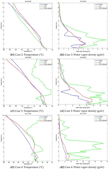 The first two cases are typical for early winter in Beijing, where the surface air temperature is about 10 °C and the humidity is around 5 g/m3. There exists a layer of stratus or stratocumulus at the level of 2–3 km. The cloud layer may be revealed by RAOB because the humidity inside the cloud is larger than the outside but the temperature decreases smoothly as height increases in the troposphere. The features above are shown well by the blue lines for RAOB in Figure 4a,b. The two cases differ in time by 24 h, but look similar, implying that the information from RAOB is reliable. The temperature profiles (red line in Figure 4(a1,b1)) are obviously closer to the RAOB than the LV2, especially above 2 km where agreement is particularly strong. The water vapor density profiles (red line in Figure 4(a2,b2)), although different from the RAOB, is in better agreement with the RAOB than the LV2, which led the water vapor density overestimated up to 10 g/m3, as compared to the truth of 4–5 g/m3.