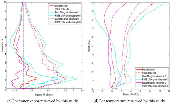 The lower two sub-panels (Figure 5c,d) are for the accuracy of water vapor density and temperature retrieved by this study. Red lines, as shown above in Figure 3, represent the accuracy of the retrievals from this study for all the 109 cloud cases. The cyan lines and the magenta lines are for high-CI and low-CI subsamples, respectively. One can see that both BIAS and RMSE of “high-CI subsample” are again larger than those of “low-CI subsample”, indicating that high-CI cloud correction is more difficult. Comparison of Figure 5c,d with Figure 5a,b shows that the BIAS and RMSE in the lower two sub-panels are much less than those in the upper two sub-panels. In the water vapor density figures, the BIAS was reduced from 9.6 to 0.5 around the height of 2.5 km, and the RMSE was reduced from 14.3 to 3.3. The accuracy of retrieved temperature is also evidently improved by this study, especially at the height above 2 km.