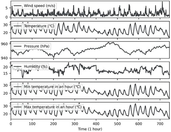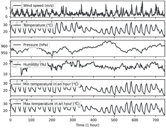 The experimental data were hourly observation data from ground observation stations (Yanqing and Zhaitang stations) provided by the China Meteorological Administration from 1 August 2020, to 31 August 2020. Figure 2 and Figure 3 show time-series diagrams of observations from the two stations. As the figures show, the data for each site included 744 samples (31 days × 24 h). In addition to the wind speed (m/s), which was measured at a height of 10 m above the ground, the meteorological elements at each point in time included surface temperature (°C), surface pressure (hPa), relative humidity (%), one-hour precipitation (Rain1h) (mm), one-hour maximum temperature (MaxT) (°C), and one-hour minimum temperature (MinT) (°C).