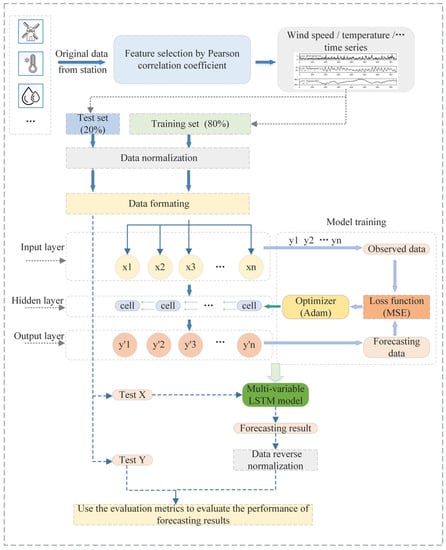 The framework of the proposed multi-variable LSTM network method for wind speed forecasting.