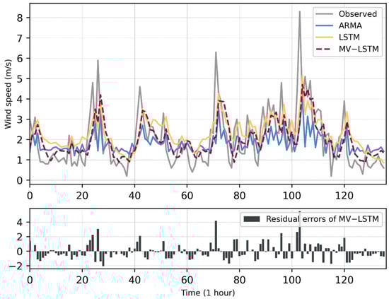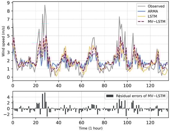 The wind speed forecasting results obtained by the different models on the dataset of Yanqing Station. In the top sub-figure, the x-axis is the wind speed value (unit: m/s), and the y-axis is the time of the data points (time interval: 1 h); in the bottom sub-figure, the x-axis is the residual errors of the MV-LSTM method (unit: m/s), and the y-axis is the same as it in the top sub-figure.