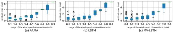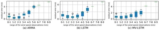 Figure 8 and Figure 9 show residual errors’ distribution of each method in different wind speed observation ranges. The x-axis represents the range of the wind speed observations, and each sub-graph displays the residual error distribution of one method. For each method, the residual error increases as the wind speed increases, which means the prediction performance of each method decreased with the increase in the wind speed. For each station, compared with the other two methods, the predicted residual increase range of the MV-LSTM model is the smallest. For Yanqing Station, when the wind speed is in the range 0–5 m/s, the residual errors of the MV-LSTM method are mostly kept below 2 m/s, which could not be achieved by the other two methods.