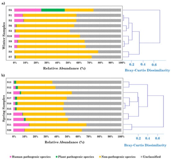 Relative percentage contribution of the overall amount of the 27 potential plant pathogenic species, 76 potential human pathogenic species, 1084 potential non-pathogenic species, and unclassified species in (a) winter (S1–S10) and (b) spring (S11–S20) samples. Bray–Curtis dissimilarity dendrograms highlighting the relatedness of the species-level bacterial communities in (a) winter and (b) spring samples have also been reported.
