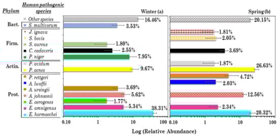 Mean percentage contribution (on a logarithmic scale) of the 10 most abundant potential and pervasive human pathogenic species in (a) winter and (b) spring: Sphingobacterium multivorum (S. multivorum), Johnsonella ignava (J. ignava), Streptococcus bovis (S. bovis), Staphylococcus aureus (S. aureus), Clostridium cadaveris (C. cadaveris), Peptococcus niger (P. niger), Propionibacterium avidum (P. avidum), Propionibacterium acnes (P. acnes), Providencia rettgeri (P. rettgeri), Acinetobacter lwoffii (A. lwoffii), Acinetobacter ursingii (A. ursingii), Acinetobacter johnsonii (A. johnsonii), Enterobacter aerogenes (E. aerogenes), Enterobacter amnigenus (E. amnigenus), and Enterobacter hormaechei (E. hormaechei). Error bars represent the standard error of the mean. Phyla related to each species are also reported on the left (Prot.: Proteobacteria, Actin.: Actinobacteria, Firm.: Firmicutes, Bact.: Bacteroidetes).