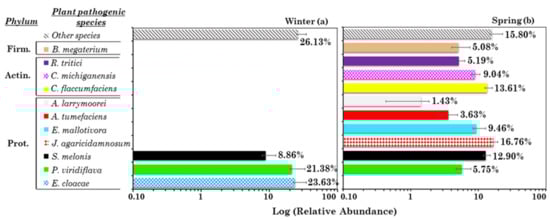 Mean percentage contribution (on a logarithmic scale) of the most abundant potential and pervasive plant pathogenic species in (a) winter and (b) spring: Bacillus megaterium (B. megaterium), Rathayibacter tritici (R. tritici), Clavibacter michiganensis (C. michiganensis), Curtobacterium flaccumfaciens (C. flaccumfaciens), Agrobacterium larrymoorei (A. larrymoorei), Erwinia mallotivora (E. mallotivora), Janthinobacterium agaricidamnosum (J. agaricidamnosum), Sphingomonas melonis (S. melonis), Pseudomonas viridiflava (P. viridiflava), and Enterobacter cloacae (E. cloacae). Error bars represent the standard error of the mean. Phyla related to each species are also reported on the left (Prot.: Proteobacteria, Actin.: Actinobacteria, Firm.: Firmicutes).