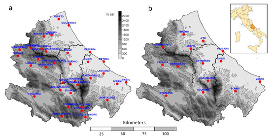 Maps showing orography of Abruzzo region and stations considered: (a) stations of point and grid daily rainfall datasets; (b) stations of 30-min rainfall dataset.
