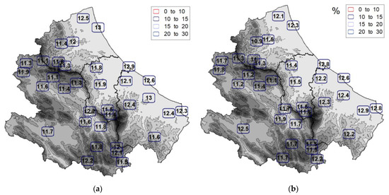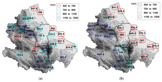 The median annual precipitation amounts of the stations were considered and obtained from both precipitation dataset is given in Figure 2. An illustration of the seasonality at each location is given in Figure S2. The two datasets depict quite similar spatial patterns with low rainfall amounts in the stations closest to the Adriatic coast. However, the grid data, derived from interpolation algorithms, present a much more reduced variability (range between 504–1085 mm) compared to point observations (range between 594–1407 mm). In particular, grid data describe a relatively regular gradient of increasing precipitation proportional to the Adriatic coast’s distance. Therefore, the grid data do not capture either precipitation peaks (corresponding to Pescasseroli, Isola del Gran Sasso and Caramanico) or the low-precipitation stations in the inland valleys of the region (as illustrated in Figure 2a). According to previous analyses [39,41], these inland stations are characterized by the typical stau-foehn effects: the air masses of Adriatic and Tyrrhenian origin, pushed inwards by depression structures, discharge their humidity on the reliefs on the arrival side, and reach the intramountain areas depleted of precipitation.