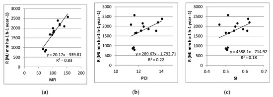 Scatter plots and linear regression lines of mean annual erosivity R vs. mean annual MFI (a), PCI (b), and SI (c) at 14 stations.