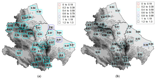 From Figure 3a, it is evident that the mean values of MFI and R are highly correlated in the Abruzzo region. Based on the Student’s t test, the regression line’s slope presented in Figure 3a is significantly different from 0 (α = 0.01). The coefficient of determination (R2 = 0.83) indicates that the regression line explains a large part of R variance. The Root Mean Square Error (RMSE) of this model is 220.2 MJ mm ha−1 h−1 year−1. A high correlation between MFI and R was already observed in Abruzzo region [16]. However, the linear model obtained in the present analysis is more reliable due to the higher number of stations considered (14 instead of 9) and the more extended time series. Moreover, in [16], the R calculation was based on the RUSLE approach [4], which tends to underestimate the energy associated with medium-low intensity rainfall events [45]. In some literature, the relationship between R and MFI was modeled by means of power models [13]. For our data, the power model has equation R = 2.42·MFI1.41, whose exponent is equal to that obtained by [13]. However, the coefficient of determination is only slightly better than the linear model (R2 = 0.84), and the RMSE is higher (RMSE = 256.4 MJ mm ha−1 h−1 year−1).