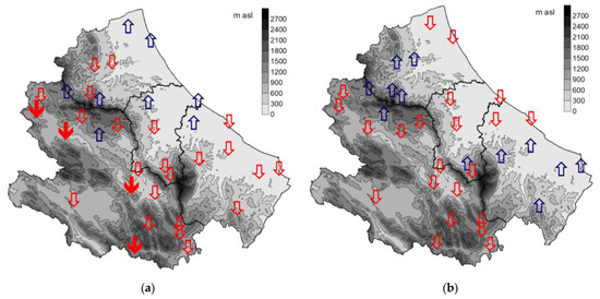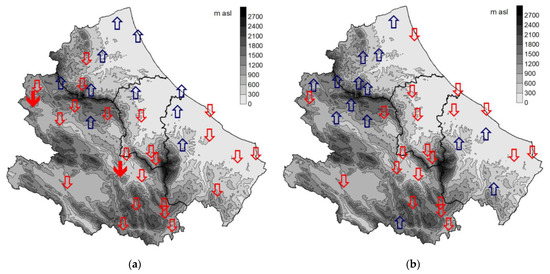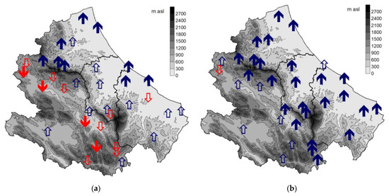 Spatial distribution of trend in MFI series (1980–2018): (a) point data; (b) grid E-OBS data. The down arrows indicate decreasing trends, while upper arrows denote increasing trends. Solid arrows indicate significant trends (p-Value < 0.10) according to Mann–Kendall test.