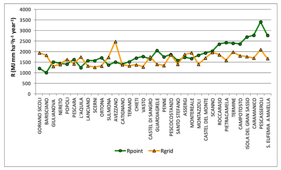 The comparison between the Rpoint and Rgrid values for each station is shown in Figure 10, where the stations are in ascending order of annual precipitation. From the comparison, it emerges that the most marked differences occur in a limited number of stations, and these are mostly situations in which Rpoint is decidedly higher than Rgrid. These stations (Campotosto, Caramanico, Isola del Gran Sasso, Pescasseroli, Pietracamela, Roccaraso, S.Eufemia Maiella, and Termine) are all located in the internal mountainous areas (as illustrated in Figure 1) and are characterized by high annual precipitation values (and therefore of MFI), which are not well captured by the grid data. For these stations, the mean difference between Rpoint and Rgrid is about 840 (MJ mm ha−1 h−1 yr−1). Excluding these stations, the regional mean values of Rpoint and Rgrid are very similar (1604 and 1595 MJ mm ha−1 h−1 yr−1, respectively). These values are consistent with the mean Italian values indicated in Panagos et al. [3].