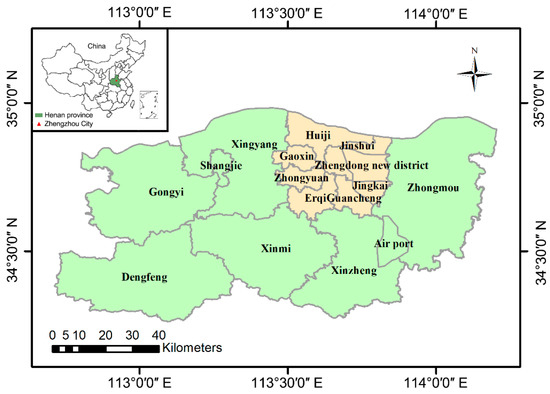Zhengzhou City, the capital of Henan Province, is a new first-tier city with an area of 7446 km2. The geographic location is between 112°42′~114°14′ E and 34°16′~34°58′ N (Figure 1). The city is characterized by the north temperate continental monsoon climate. According to the meteorological data and the Statistical Yearbook of Henan province in 2016, the mean temperature of Zhengzhou was 15.9 °C, the annual average precipitation was 684.3 mm, and the average wind speed was 2.6 m/s.