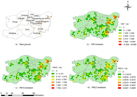 Bare grounds were mainly distributed in Zhongmou and Xinzheng districts with a total area of 68.97 km2 (Figure 3a). Figure 3b–d displayed the spatial distribution of TSP, PM10 and PM2.5 emission from soil dust source with a grid of 3 km × 3 km resolution. Results showed that the emissions of TSP, PM10 and PM2.5 from soil dust source were 507.40 t·a−1, 45.53 t·a−1 and 1.30 t·a−1, respectively, in Zhengzhou city. From the spatial distribution, PM emission from soil dust source was higher in Zhongmou and Xinzheng, which is consistent with the distribution characteristic of bare grounds. Soil dust emission is strongly under the influence of meteorological conditions and human activities [29]. In addition, soil texture and topography are also important factors that affect PM emission from soil dust source [30]. The airport economy zone also had high PM emission from soil dust source—the reason is that the soil type is mainly silt soil, which can be easily raised into the air by wind and human activities and, therefore, lead to a high emission coefficient. Dengfeng and Xinmi have complex mountainous terrain that decreases from north to south. Affected by topographic conditions, although the area of bare ground was not small in the two regions, the reduced effects of wind and less human activities are the main reasons for low PM emission. Xingyang, Gongyi and the central urban area of Zhengzhou had minimum PM emission from soil dust source, it is mainly due to the small area of bare grounds.