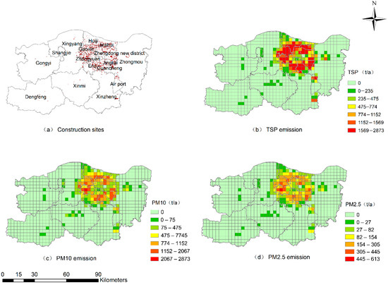 There were 1793 plots of construction sites in Zhengzhou city with a total area of 145.25 km2, which was mainly distributed in the central urban area (Figure 4a). The emission of TSP, PM10 and PM2.5 from the construction dust source was calculated to be 181.5 kt·a−1, 93.0 kt·a−1and 19.8 kt·a−1, respectively. The spatial distribution of TSP, PM10 and PM2.5 emission indicated that PM emission from the construction dust source is closely related to the population density and the regional development degree (Figure 4b–d). Emissions of TSP, PM10 and PM2.5 were mainly distributed in districts with high developed culture and economics, including Zhongyuan, Huiji, Jinshui and Zhengdong New District. The large population and high economic development in these regions bring about lots of construction activities, which induced an urban-area-centered high PM emission circle. Zhongmou, Xingyang and Xinzheng, bordering the main urban area, also have high PM emission. It is mainly due to the influence of urban expansion and economic radiation. The low PM emission area was located at Gongyi and Dengfeng, which is far away from the main urban zone of Zhengzhou. The lack of leading industries and small stress on housing supply resulted in less construction activity, which is assumed to be the main reason for lower PM emission from construction dust source [31].