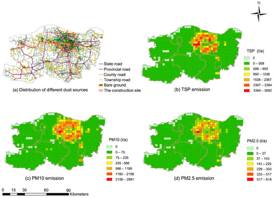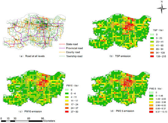 Figure 5a shows the distribution of roads in Zhengzhou city, and the total length of paved roads was 10,601.50 km, of which the lengths of the national road, provincial road, county road and township road were 396.30 km, 901.40 km, 2439.88 km and 6863.92 km, respectively. It has been calculated that the total emissions of TSP, PM10 and PM2.5 from paved roads were 55.5 kt·a−1, 10.7 kt·a−1 and 2.6 kt·a−1, respectively (Table 2). Among different levels of roads, township road has the highest PM emission, followed by the provincial road, county road and national road. One reason for this phenomenon is that the township road is more densely distributed than that of other types of road; the other reason is that the road dust load of the township road is relatively large (Table 1). As for the provincial road, although the dust load of the provincial road is small, the heavy traffic volume leads to a high emission coefficient, which resulted in the high PM emission.