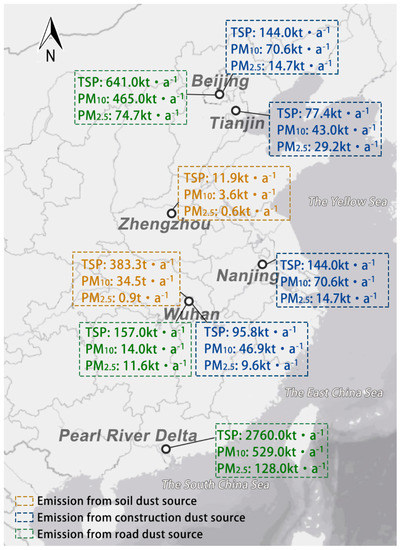 - Li, T.; Bi, X.; Dai, Q.; Liu, B.; Han, Y.; You, H.; Wang, L.; Zhang, J.; Cheng, Y.; Zhang, Y. Improving spatial resolution of soil fugitive dust emission inventory using RS-GIS technology: An application case in Tianjin, China. Atmos. Environ. 2018, 191, 46–54. [Google Scholar] [CrossRef]