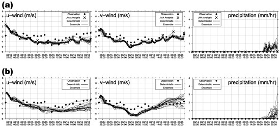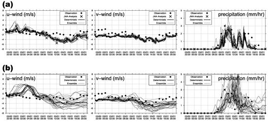 (a) Ensemble analysis members and a deterministic analysis member of east-west wind (u component), north-south wind (v component), and precipitation at the model surface layer (below 40 m) of the grid corresponding to Hitachi from 21:00 14 March to 21:00 15 March local time. (b) Same as (a) except for forecast members, which were initiated at 21:00 14 March local time. Circles indicate AMeDAS observations. Crosses indicate the JMA operational 5 km gridded analysis for the daily weather forecast.