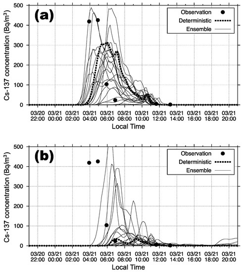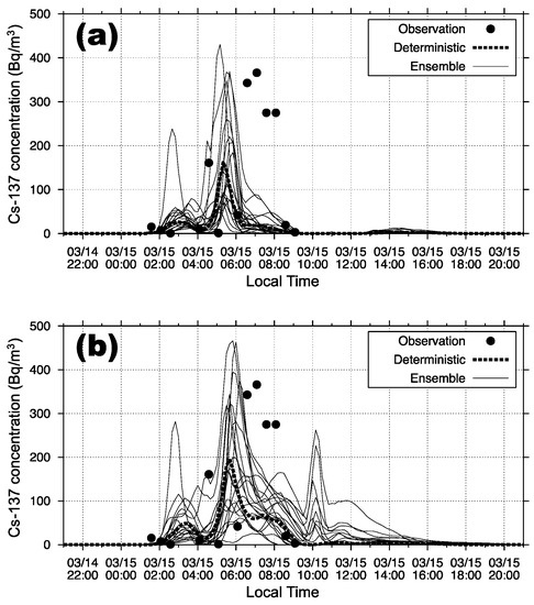 We used the emission scenario of the radioactive Cs-137, which was released from the FDNPP, estimated by the Japan Atomic Energy Agency (JAEA) [55,56,57]. Cs-containing sulfate-organics-mixed aerosol particles [58] were injected at every time step into a grid cell above the FDNPP. The emission scenario has been revised by JAEA several times after 2012, e.g., [59]. However, the difference between the previous ones and the revised ones is not very large in comparison with the dispersion model uncertainty (i.e., ensemble spread) of Cs-137 concentrations in this study. Since we focus on the quantification of the dispersion model uncertainty, the revision of the Cs-137 emission scenario scarcely affects the results of the uncertainty evaluation in this study.
