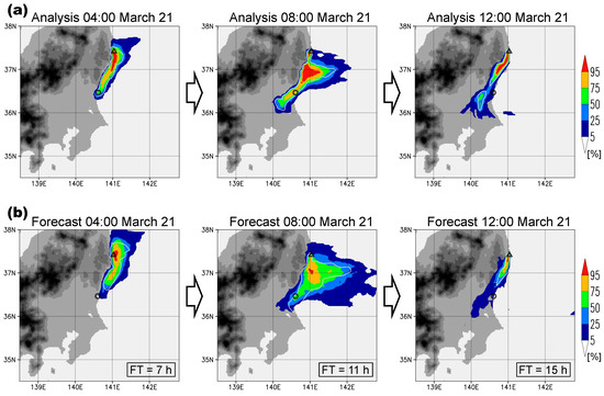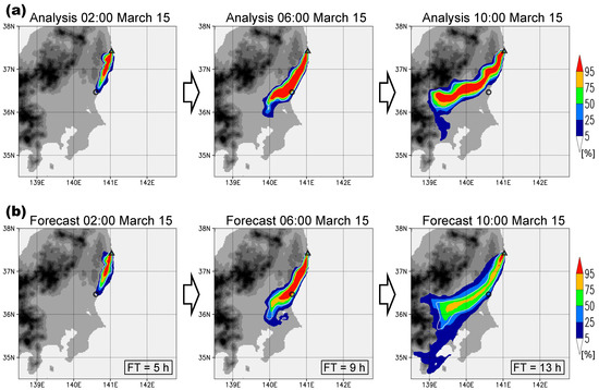 In this period, the radioactive aerosol plume projected from the FDNPP to the south, coastwise, and then swept across Tokai (Figure 4). The percentile distribution of the 20 ensemble members was narrow in the analysis (Figure 4a) but relatively broad in the forecast (Figure 4b), which was in agreement with the time series of the ensemble analysis/forecast concentrations at Tokai that are shown in Figure 3. The threshold (15 Bq/m3) used here was defined as the half value of the air quality standard of Japan’s radioisotope regulations. The percentile distribution of aerosol concentrations can be usefully applied to probabilistic forecasts such as the chance-of-rain forecast. The probabilistic forecasts provide multiple scenarios for environmental pollution or disasters. Generally, the accuracy of the forecast decreases with time, and consequently the percentile distribution tends to diffuse with time. Figure 4 shows that the forecast percentile distributions were very similar to the analysis percentile distributions in the short forecasts (02:00 15 March and 06:00 15 March), indicating the high accuracy of the forecast. However, the distributions were less similar in the longer forecast (10:00 15 March), in which the forecast percentile distribution was diffused.