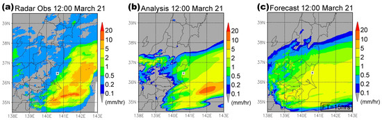Precipitation (mm/hr) from 11:00 to 12:00 21 March local time derived from (a) the JMA operational radar/rain-gauge analyzed observations, (b) the deterministic analysis, (c) and the deterministic 15-h forecast. The cross mark illustrates the location of Tokai.