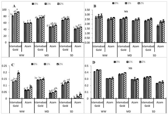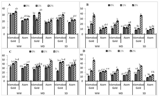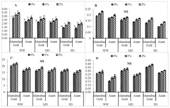Similarly, exogenous K increased the SL and SDW, and the longest and heaviest shoots were produced by Islamabad Gold with the 2% potassium sulfate solution under WW conditions, while the minimum corresponding values were recorded for Azam with water spraying under SD (Figure 1C,D).