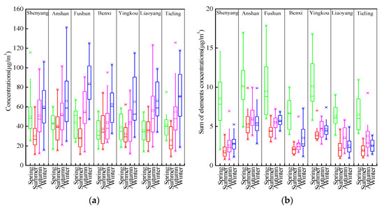 The concentrations of different elements vary across different seasons. Figure 4 shows the changes in concentration of 24 elements over time and space. The concentration of K was relatively high in autumn and winter in all cities except Shenyang; this is because K is identified as a marker element of biomass combustion [32], which mostly occurs in autumn and winter in this area. The concentration of K was highest overall in Anshan, Fushun, and Liaoyang, which is the same as the results indicated by the PMF. The concentration of Ca was high in spring, which is due to the sand blown into the air by the heavy spring winds and the pollution caused by soil dust [19]. The concentration of Ca was the highest in Yingkou, which corresponds to soil dust’s large contribution (30.47%) in the PMF results. The concentrations of Mg are explained by the same mechanisms as Ca, as the crustal elements had higher concentrations in spring. The concentrations of Mg were highest in Anshan due to the presence of the magnesite clinker industry. The concentration of As is the highest in winter, as it is an indicator element of coal combustion, and coal combustion increases in the cold months. Due to the high As concentration in Anshan and Liaoyang, the contribution of coal combustion as a pollution source is also high. The concentration changes of Cd and Pb were the same as those of As, both of which were higher in winter, which was also demonstrated by research conducted in Xianlin, Nanjing [30]. The highest concentrations of all three elements were seen in Anshan. In general, the concentrations of most crustal elements were higher in spring, while the concentrations of man-made elements were higher in winter.