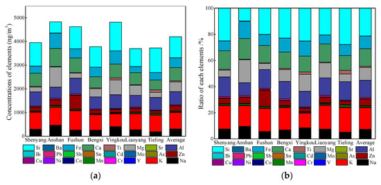 where CODjk is the coefficient of divergence, p is the number of element components participating in the calculation, and and represent the average concentration for an element component, i, at sites j and k, respectively. It has been reported that if COD approaches 0, concentrations can be considered to be spatially homogeneous; if COD approaches 1, the difference is more significant [27,28]. As shown in Table S1, the COD value in (a) ranged from 0.12 to 0.16, and in (b) ranged from 0.12 to 0.13. Therefore, the spatial variation of the elements of PM2.5 in the same city is not significant. The average value of the sites is used to represent the concentration in Shenyang and Anshan, respectively, in subsequent discussions.