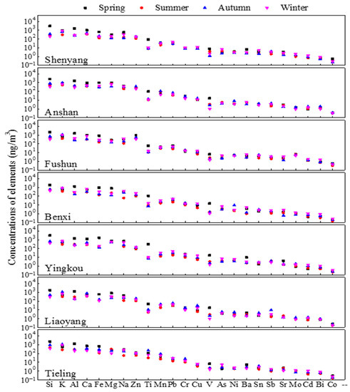 The average PM2.5 concentrations appeared to have significant seasonality. Comparatively higher concentrations of PM2.5 occurred in winter, whereas the lowest concentrations were recorded in summer in all seven cities. The high concentrations of Mg in Anshan and Yingkou were due to the relatively developed magnesite clinker industry in these cities. The concentration of K was highest in Fushun due to abundant biomass combustion. The highest concentrations of Si were seen in Anshan and Tieling, at 1207.18 ng/m3 and 1038.72 ng/m3, respectively. In Anshan, the high concentrations of As and Cr were due to coal combustion. In general, the concentrations of most crustal elements were higher in spring, while the concentrations of man-made elements were higher in winter.