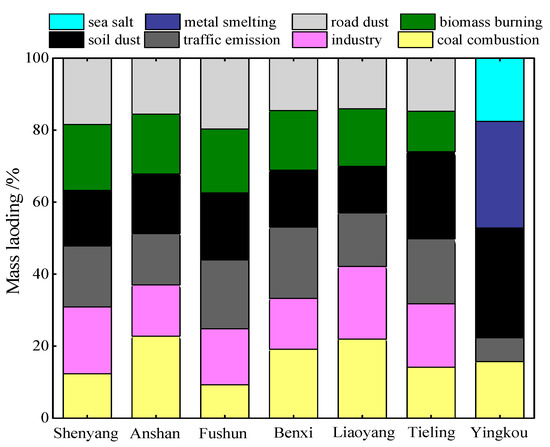 PMF modelling results showed that coal combustion, industry, traffic emission, soil dust, biomass burning, and road dust were the main sources of measured elements in six cities except Yingkou. In Yingkou, the five major sources were identified as coal combustion, metal smelting, traffic emission, soil dust, and sea salt.