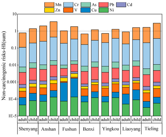 The HI values for children were higher than the safe level (HI = 1) at each site, while the HI values for adults were higher than the safe level at Anshan, Fushun, and Tieling. The accumulative non-carcinogenic risks for the human body were mainly caused by Cr and Mn, especially Mn. According to the PMF results of each city, the main sources of Mn are coal burning and biomass combustion, while the main sources of Cr are coal burning and traffic emission.