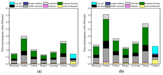 Non-carcinogenic risks (sum HI) to adults and children from the PMF-identified sources of PM2.5 in seven cities ((a) non-carcinogenic risks to adults and (b) non-carcinogenic risks to children). While the first six cities share the same sources, Yingkou is different from them.
