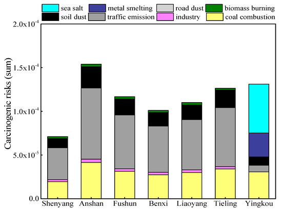 Figure 8 shows the carcinogenic risks of each source in the seven cities. From the figure, Anshan had the highest carcinogenic risk at 1.54 × 10−4, while Shenyang had the lowest risk at 7.12 × 10−5. In the six cities other than Yingkou, only road dust had a combined single-factor risk value of less than 10−6, below the level of causing a cancer risk. The carcinogenic risks of the other five pollution sources were between 10−4 and 10−6. Traffic emission and coal combustion both cause a high risk of cancer. In Yingkou, sea salt and coal combustion pose the highest cancer risks. Therefore, the cumulative carcinogenic risks caused by coal sources should be paid close attention to in urban agglomerations.