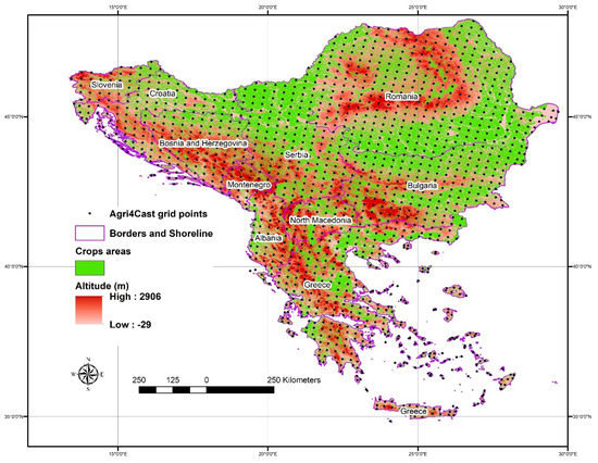 To examine the agrometeorological conditions and the agroclimatic trends of the study area, we utilized the fine-scale gridded meteorological dataset Agri4Cast of the JRC MARS Meteorological Database. This dataset contains meteorological observations from weather stations, interpolated to a regular 25 × 25 km grid on a daily basis. The initial data carried out from synoptic weather stations, mainly on the European continent, and after an interpolation process, the dataset is freely available. The primary purpose of the Agri4Cast dataset is the deriving of agrometeorological indicators for crop modelling when at the same time it is a valuable dataset for agroclimatic assessment [43,44]. Moreover, the Agri4Cast, according to its evaluation, has a high spatial and temporal accuracy and can be a reasonable basis for agroclimatic and agrometeorological research [45]. For the selected study area, there are 1532 grid points (Figure 1) covering canonically every part of the Balkan peninsula.