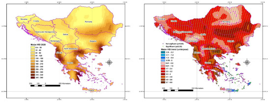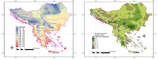 The left part of the spatial distribution map (Figure 2) depicts the GDD for the year 2020, and in the right part of the figure, there is the trend of the same parameter. As it is anticipated, the high values of the thermal time are presented over the southern parts of the Balkan’s peninsula and over the coastal areas with low altitude. The value of the 2000 GDD units can be achieved over most of Greece, along with the lowland of Bulgaria and Romania. Moreover, coastal Albania is suitable for maize cultivation according to this criterion. Lower GDD values are calculated over the Carpathians, northern Montenegro and Slovenia.